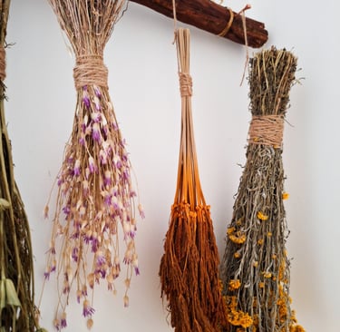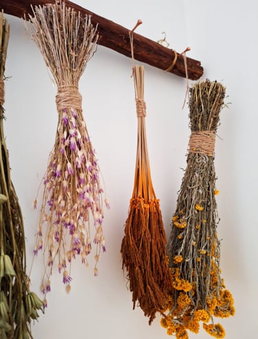 We foraged wood branches and turned a boring white wall in the stairs into a dried flower wall giving witchy vibes